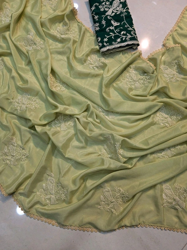 Chinon Multi Embroidery Work Saree With Contrast Running Embroidery Work Blouse
