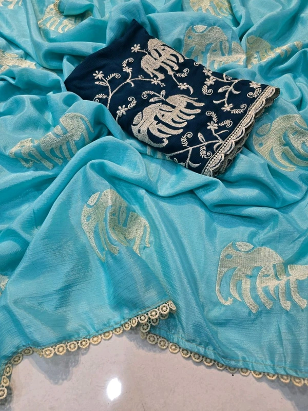 Chinon Multi Embroidery Work Saree With Contrast Running Embroidery Work Blouse