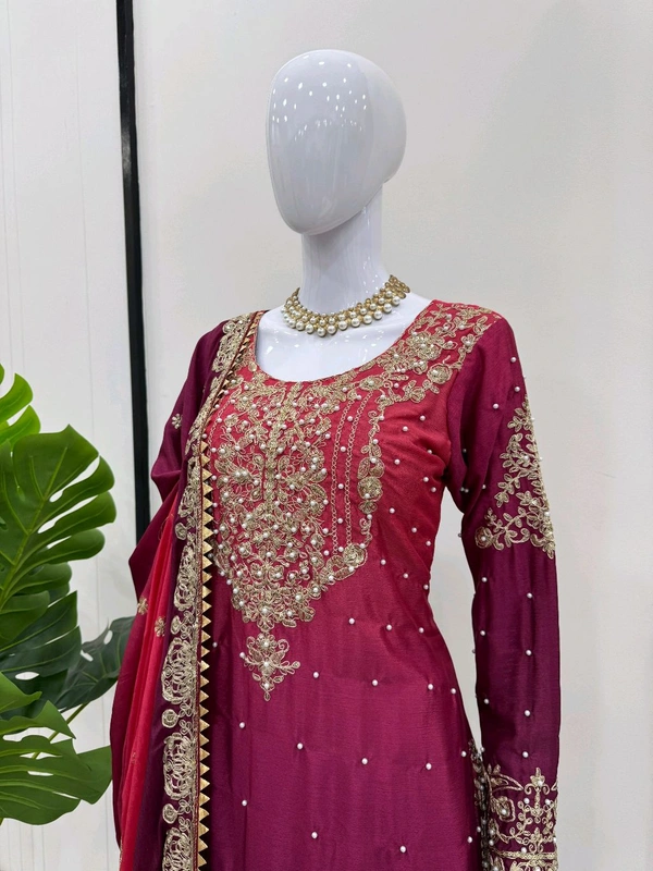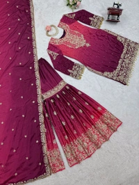 Looking for this same colour beautiful Designer Suit on Havy Chinon febric with Inner and Coding & Sequnce work with Pearl work and Sharara on also Havy Chinon Febric With Coding & Sequnce work with pearl & Fancy Lace and Dupatta on also Havy Chinon Febric With Coding & Sequnce work with pearl & Fancy Lace.