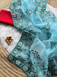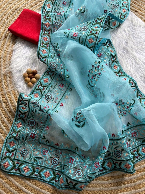 Superb Soft Refined Organza Silk Saree With Embroidery Thread work in viscos thread With Raw silk blouse