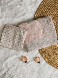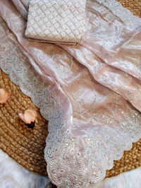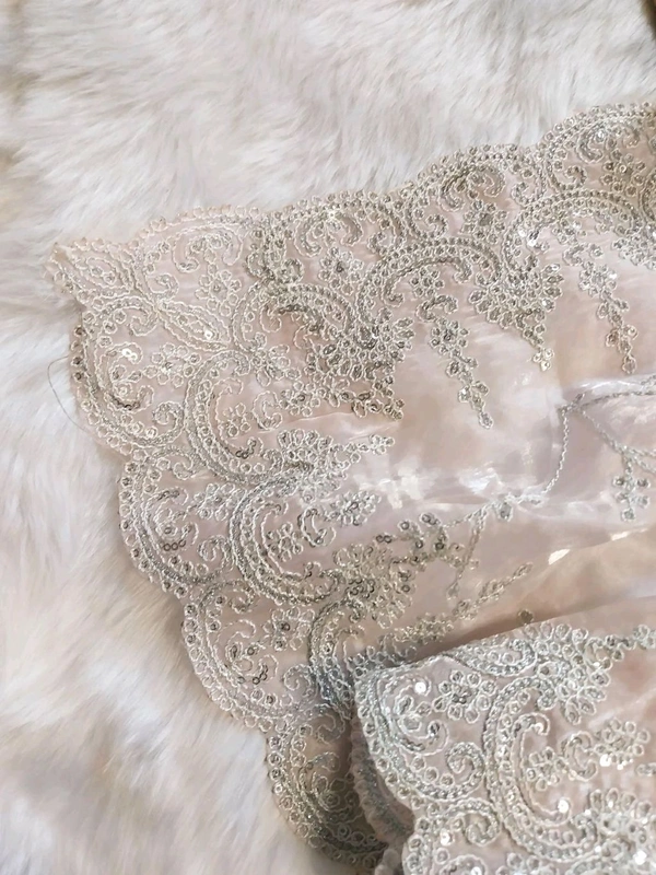 Delicate, lustrous & lightweight — featuring silver floral embroidery, cutwork borders, and rich handwork in silver zari & sequins.