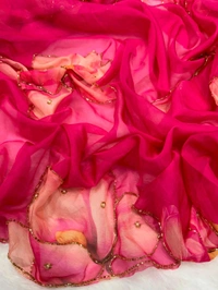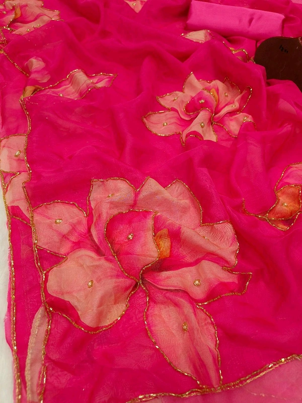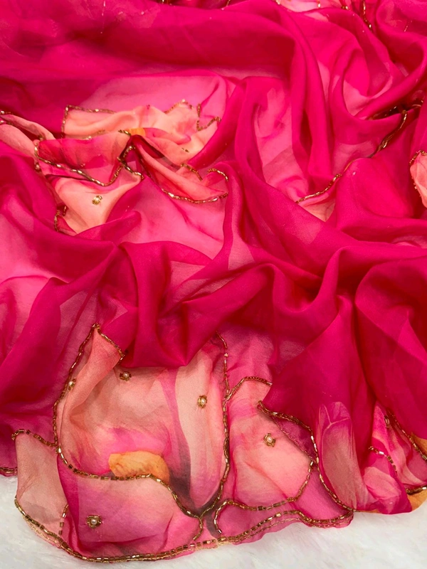 Soft Mulmul organza saree with beautiful print all over with heavy handwork and plain silk blouseOnly at