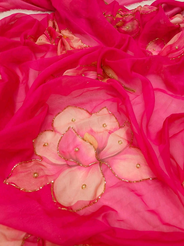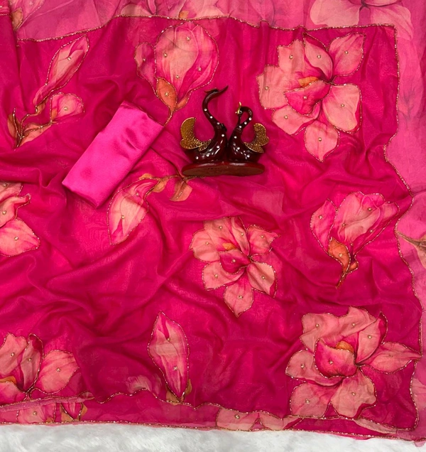 Soft Mulmul organza saree with beautiful print all over with heavy handwork and plain silk blouse